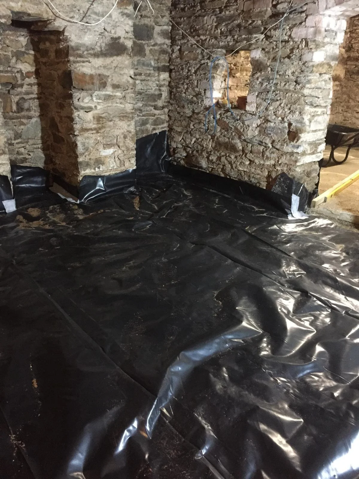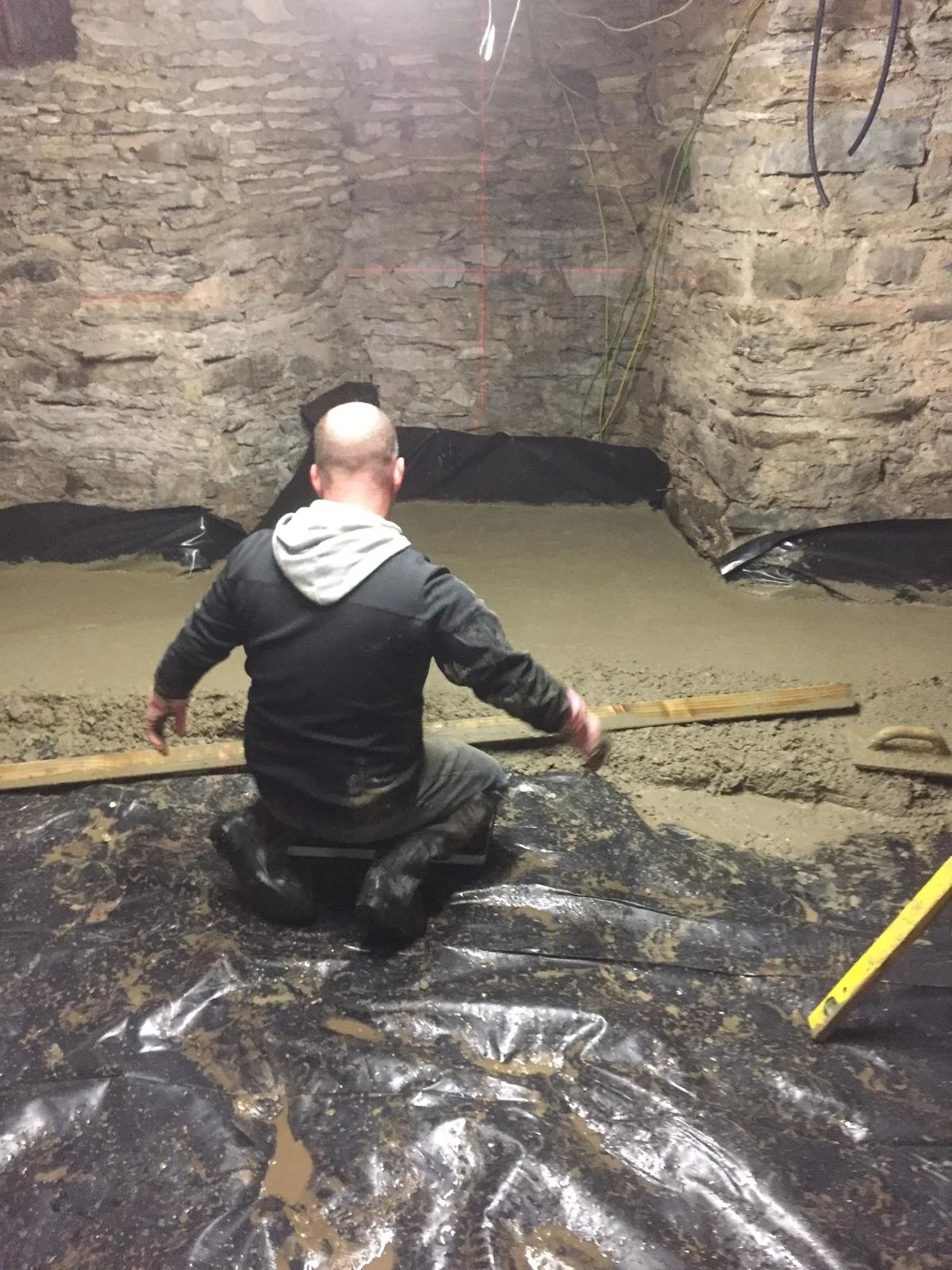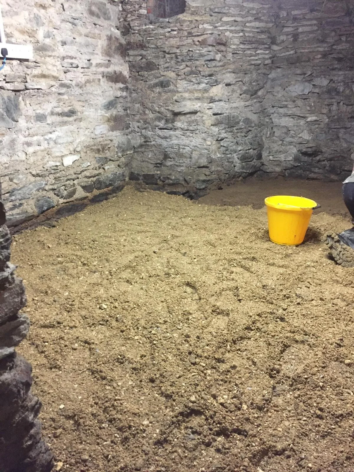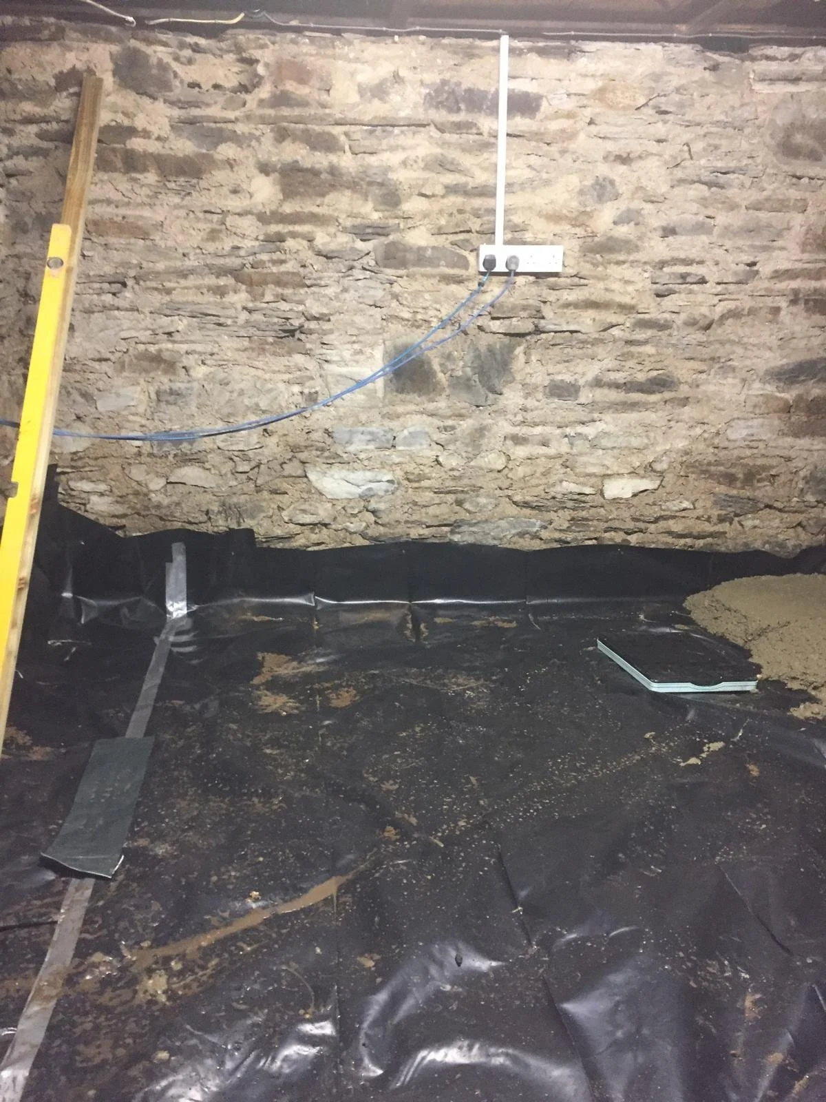 Cleared the basement floor of all debris and carefully blinded it with a layer of sand. Followed by the installation of a 1000-guage/250mu damp-proof membrane, then the concrete floor was poured and finished on top of the damp-proofing.