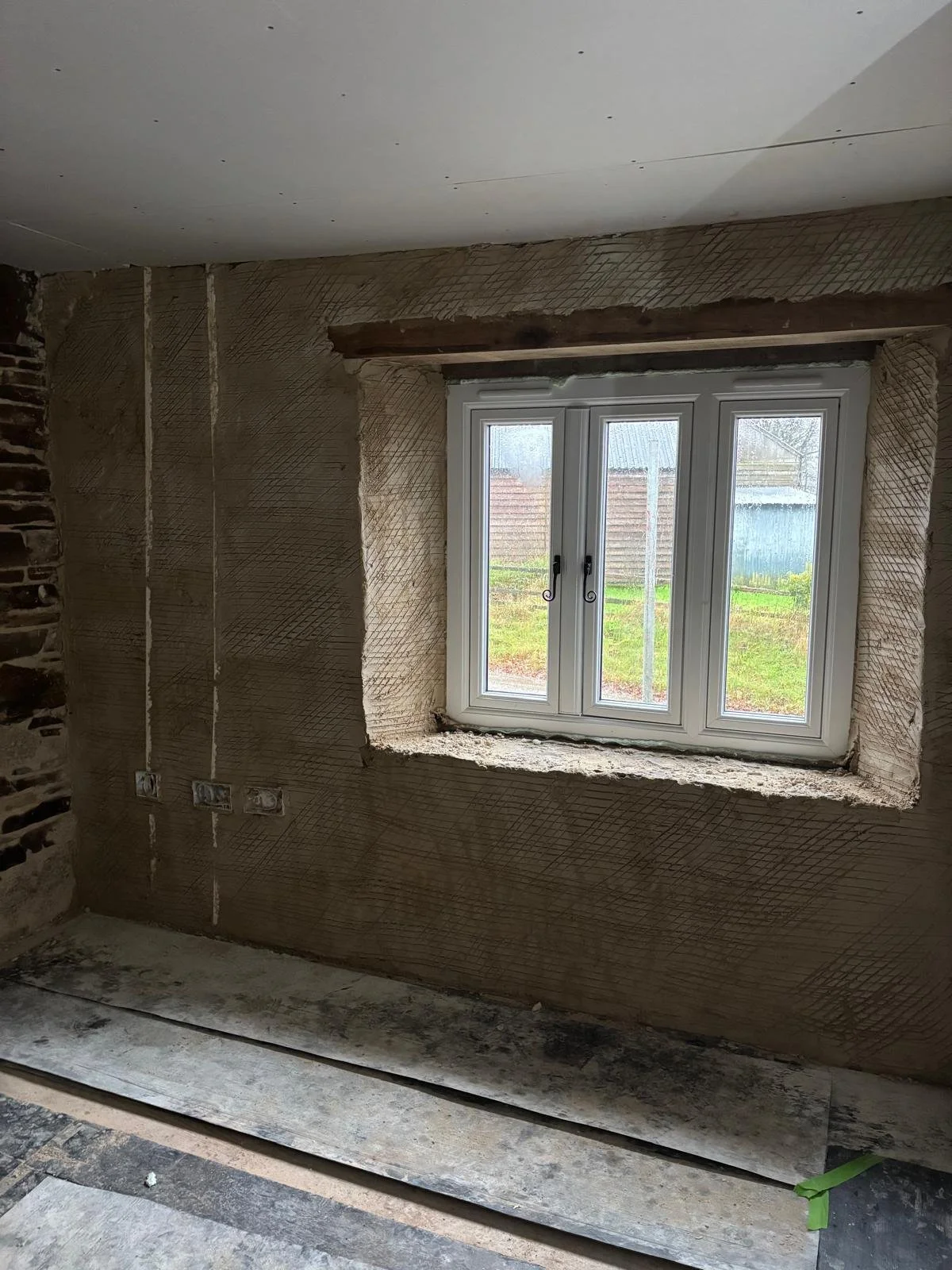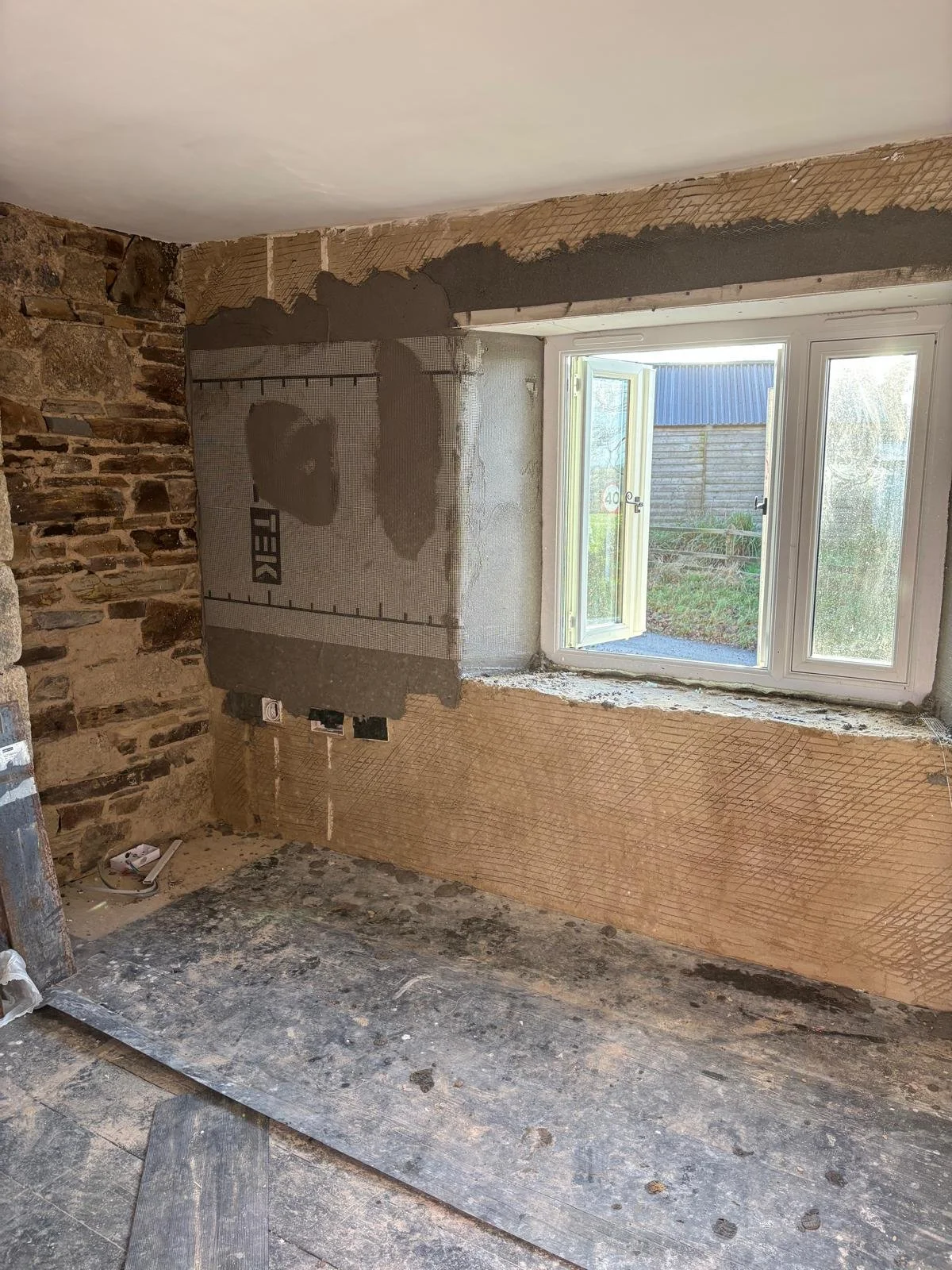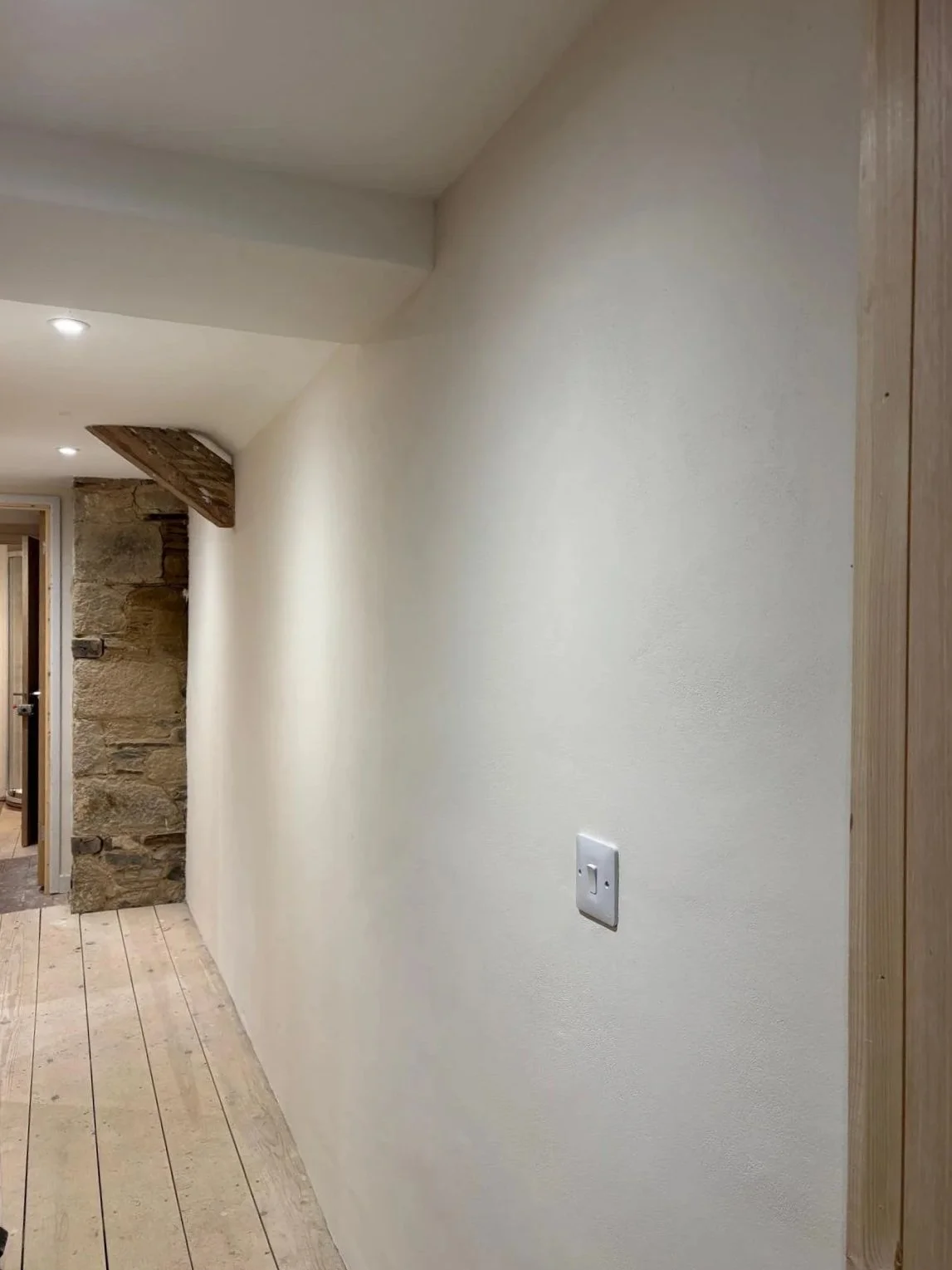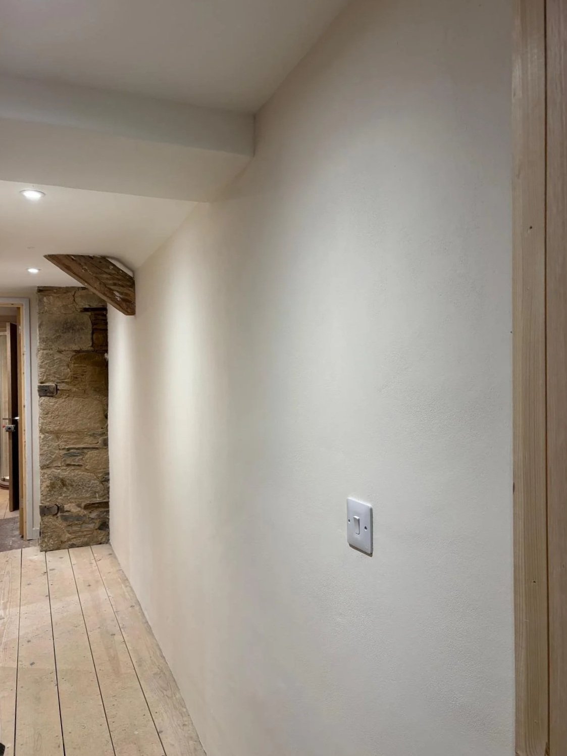 Internal lime plastering of a period stone property using natural hydraulic lime and sand, combined with Ecocork thermal render to improve thermal efficiency and reduce heat loss. The system is finished with Reabilita lime finishing plaster, providing a breathable surface that accommodates moisture movement as required in a historic building, supporting long‑term moisture management and ensuring compatibility with the existing fabric.