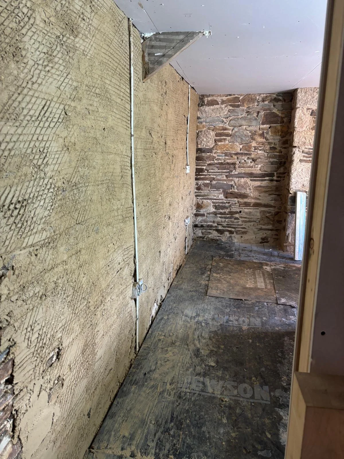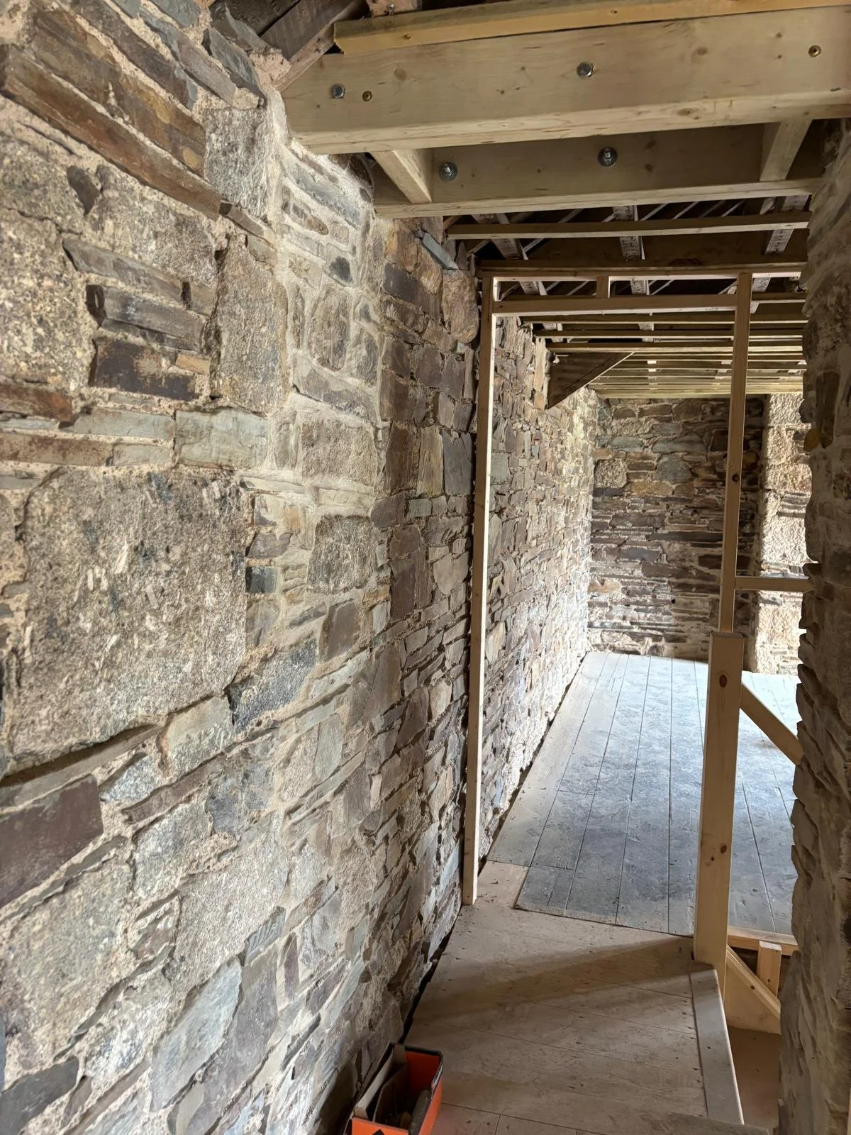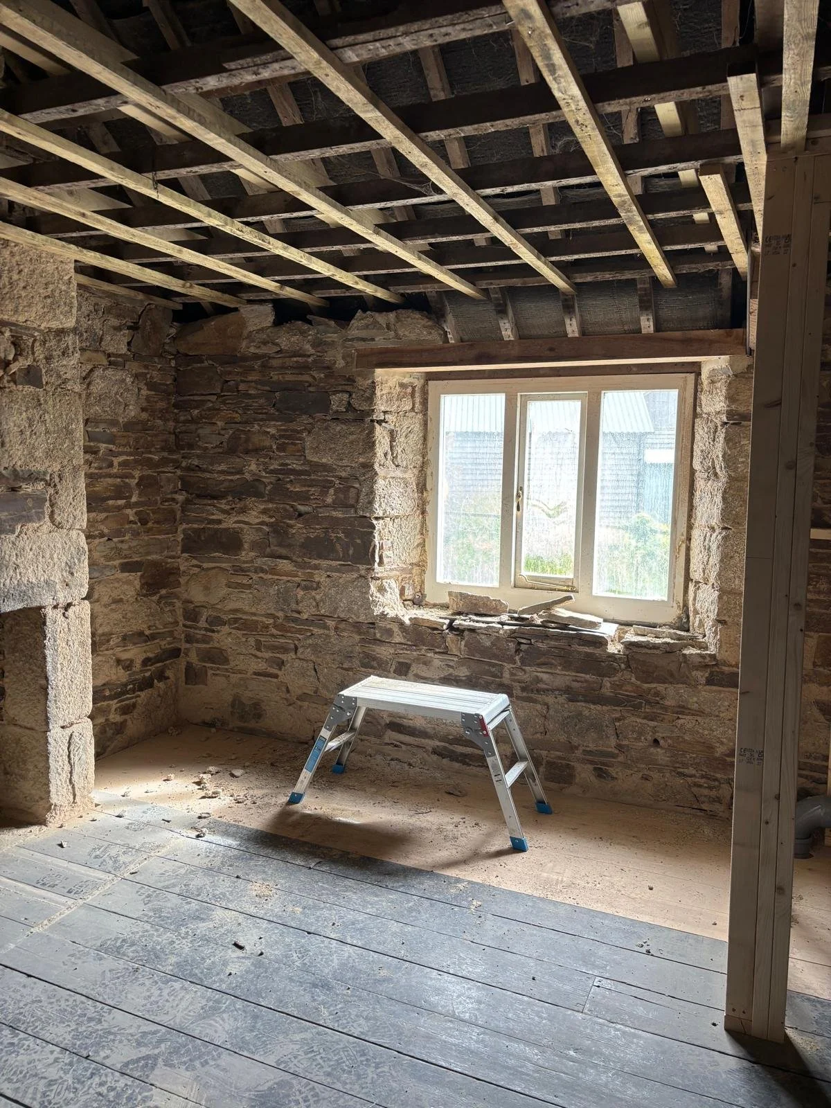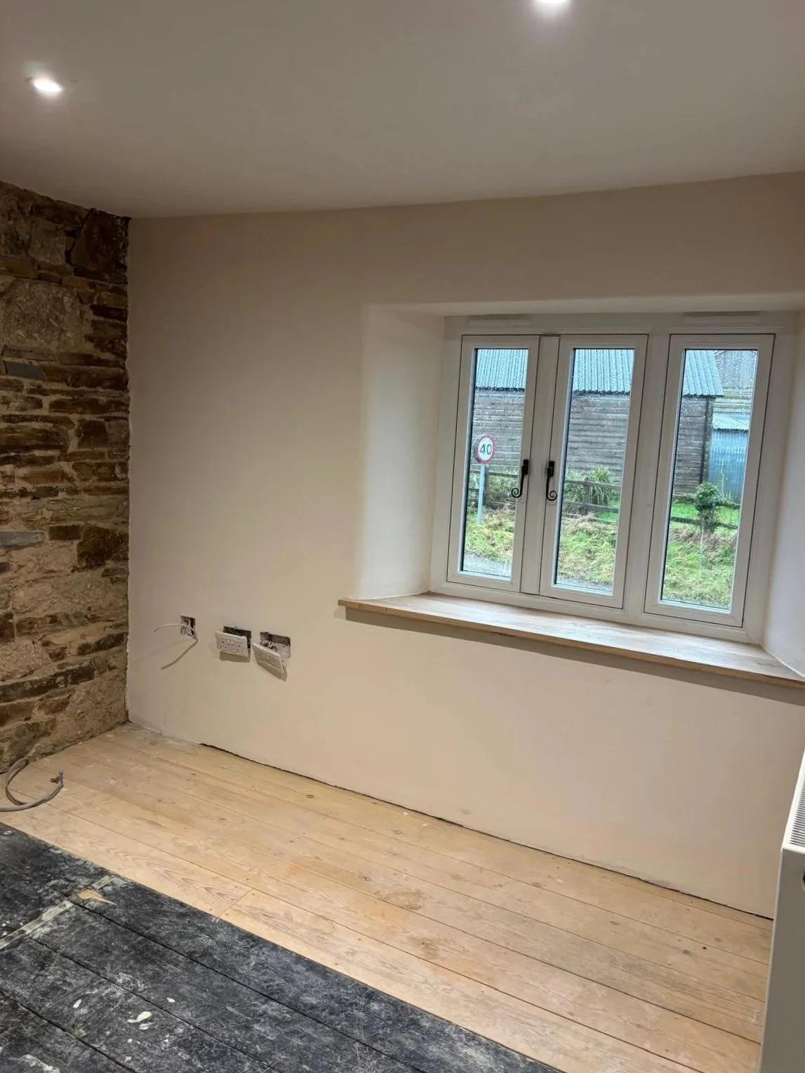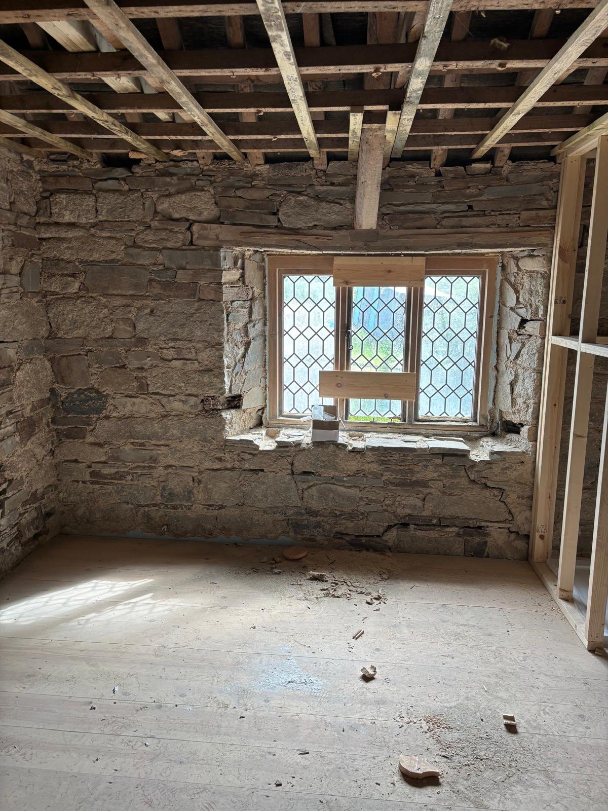 Internal lime plastering of a period stone property using natural hydraulic lime and sand, combined with Ecocork thermal render to improve thermal efficiency and reduce heat loss. The system is finished with Reabilita lime finishing plaster, providing a breathable surface that accommodates moisture movement as required in a historic building, supporting long‑term moisture management and ensuring compatibility with the existing fabric.