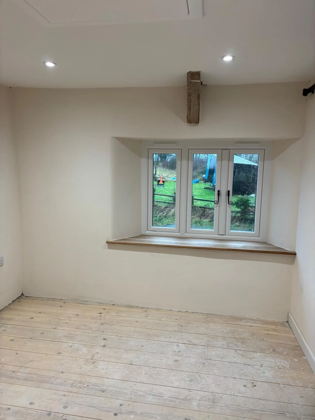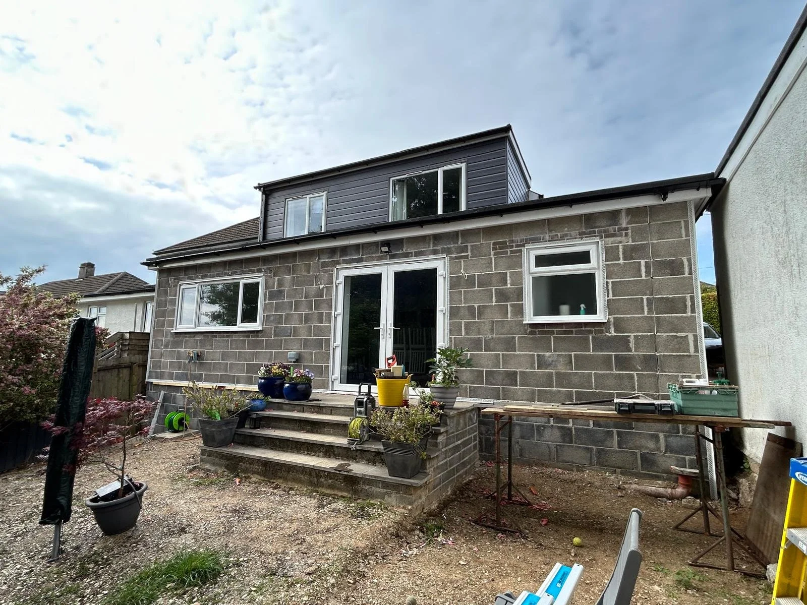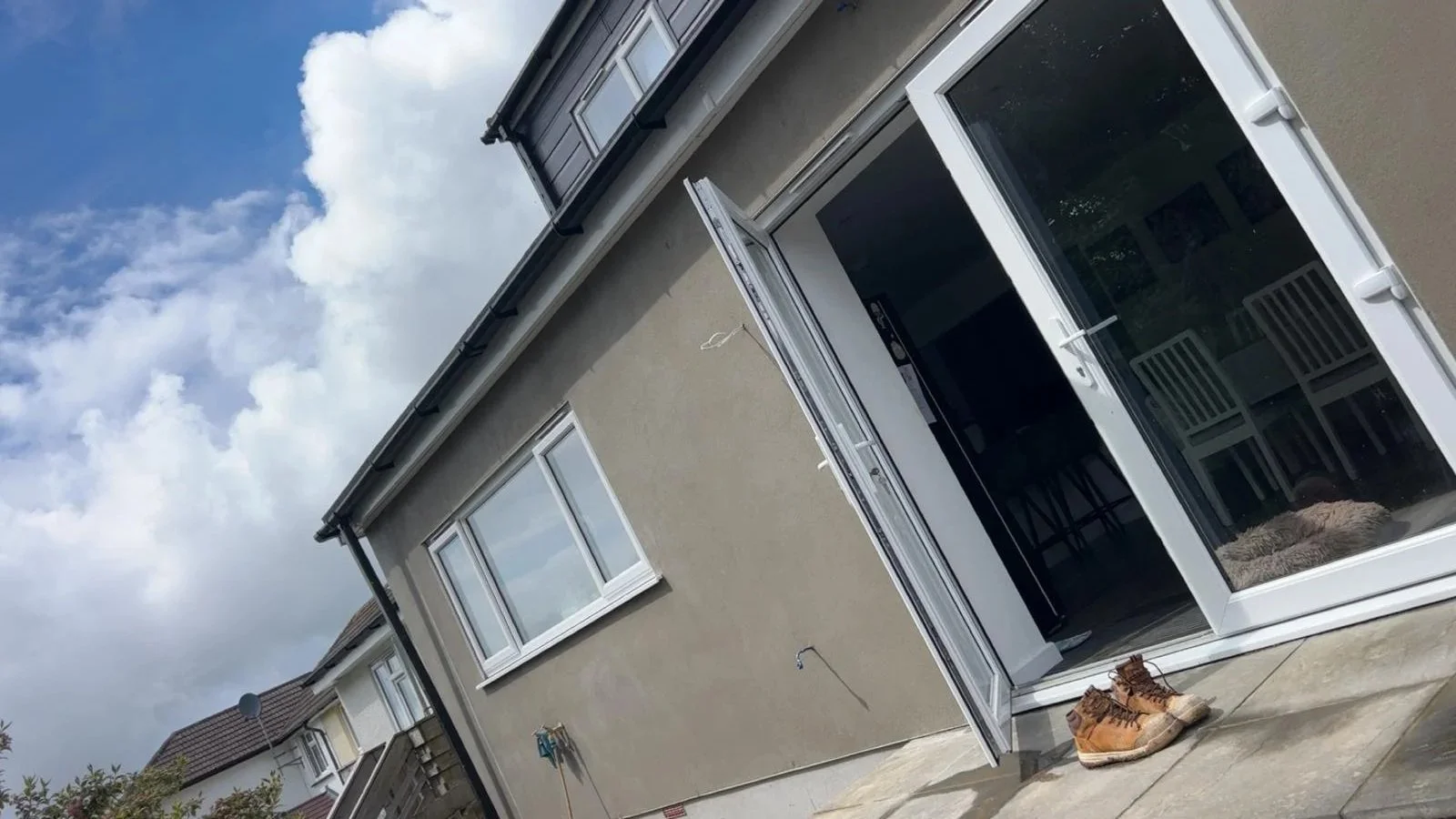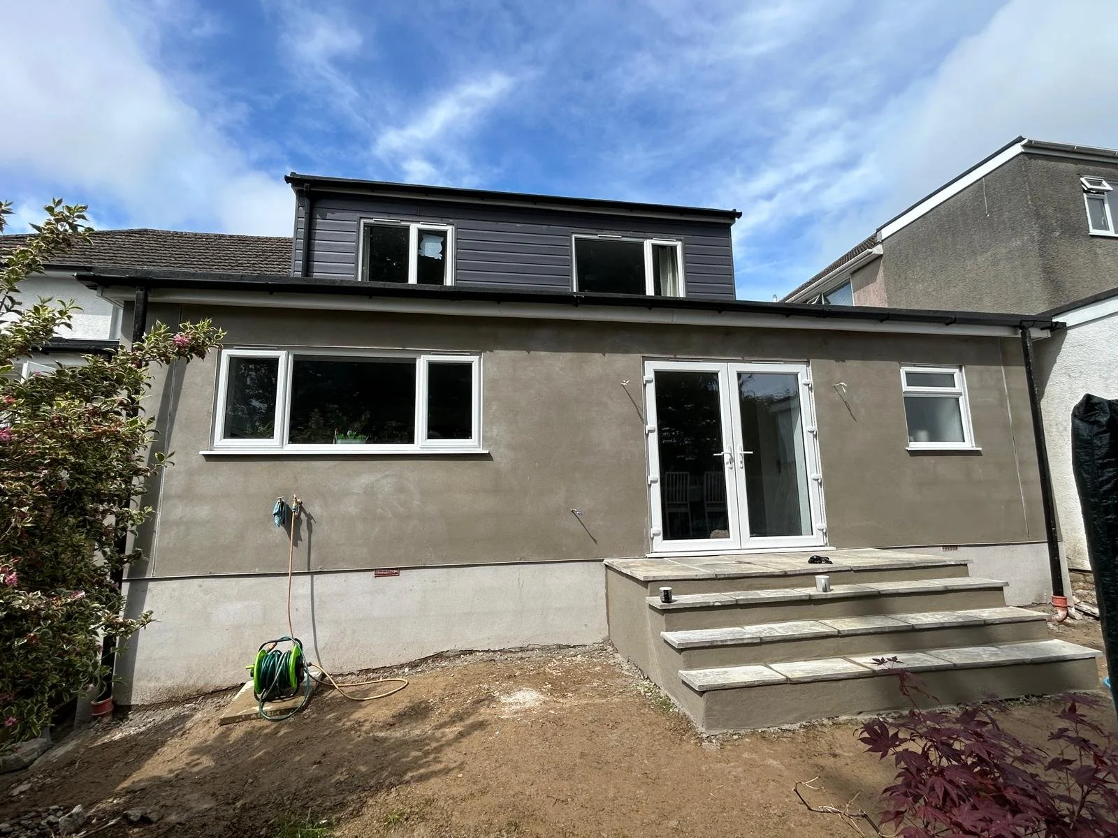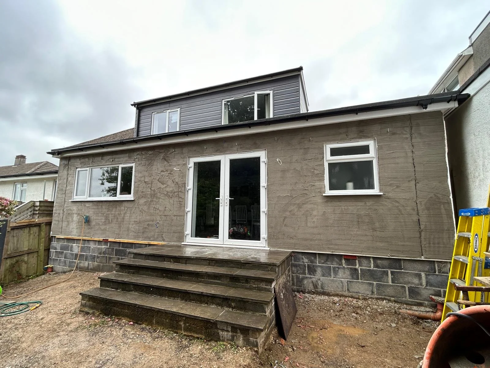 Conventional sand and cement render applied to new extension blockwork, finished to a smooth, durable surface.