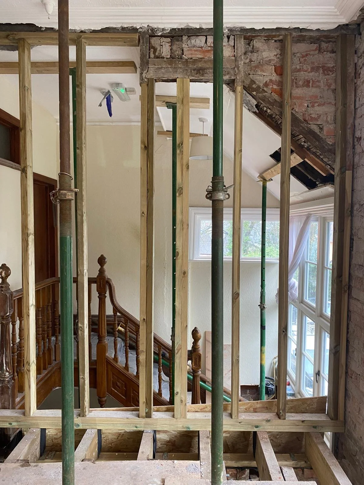 This period property suffered significant dry rot which compromised the structural integrity, necessitating the removal of all affected structural timbers from the ground floor up to the second floor.