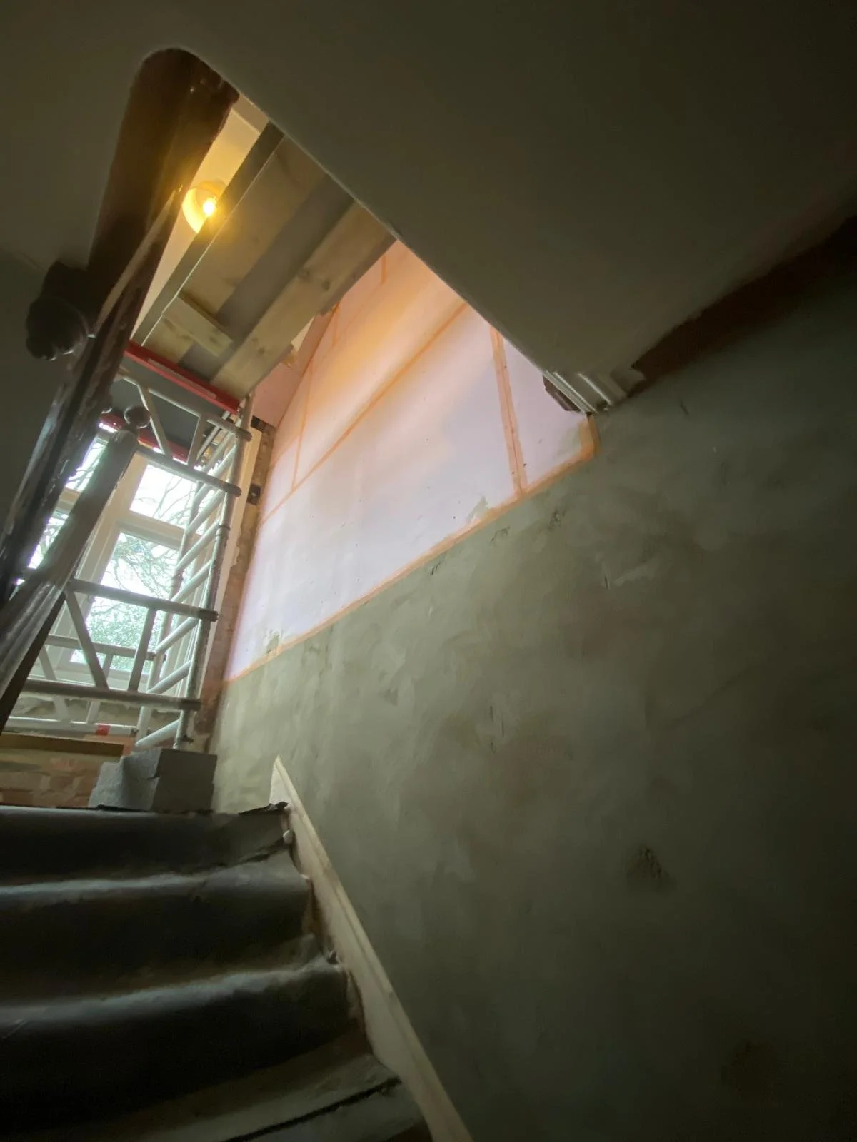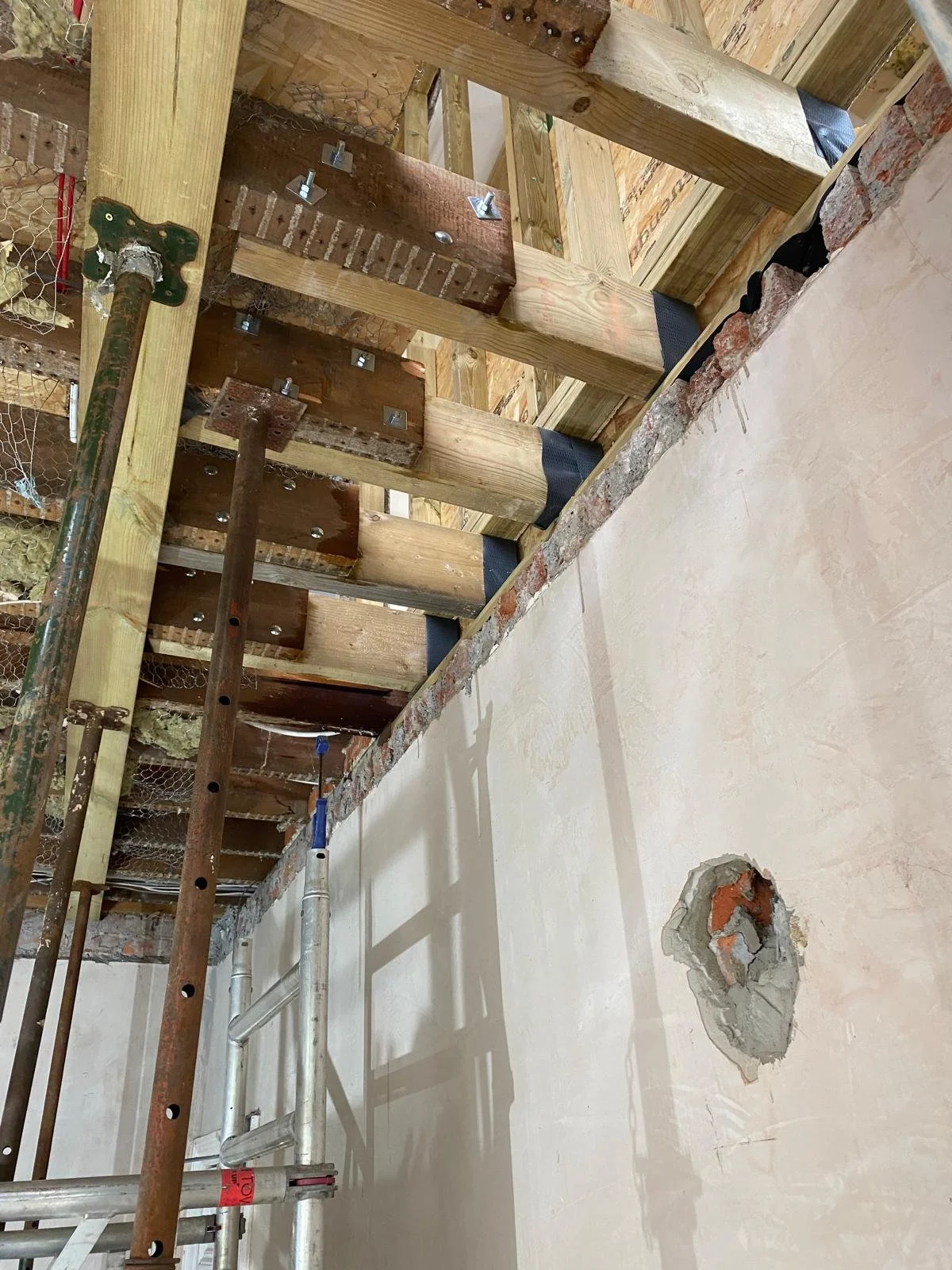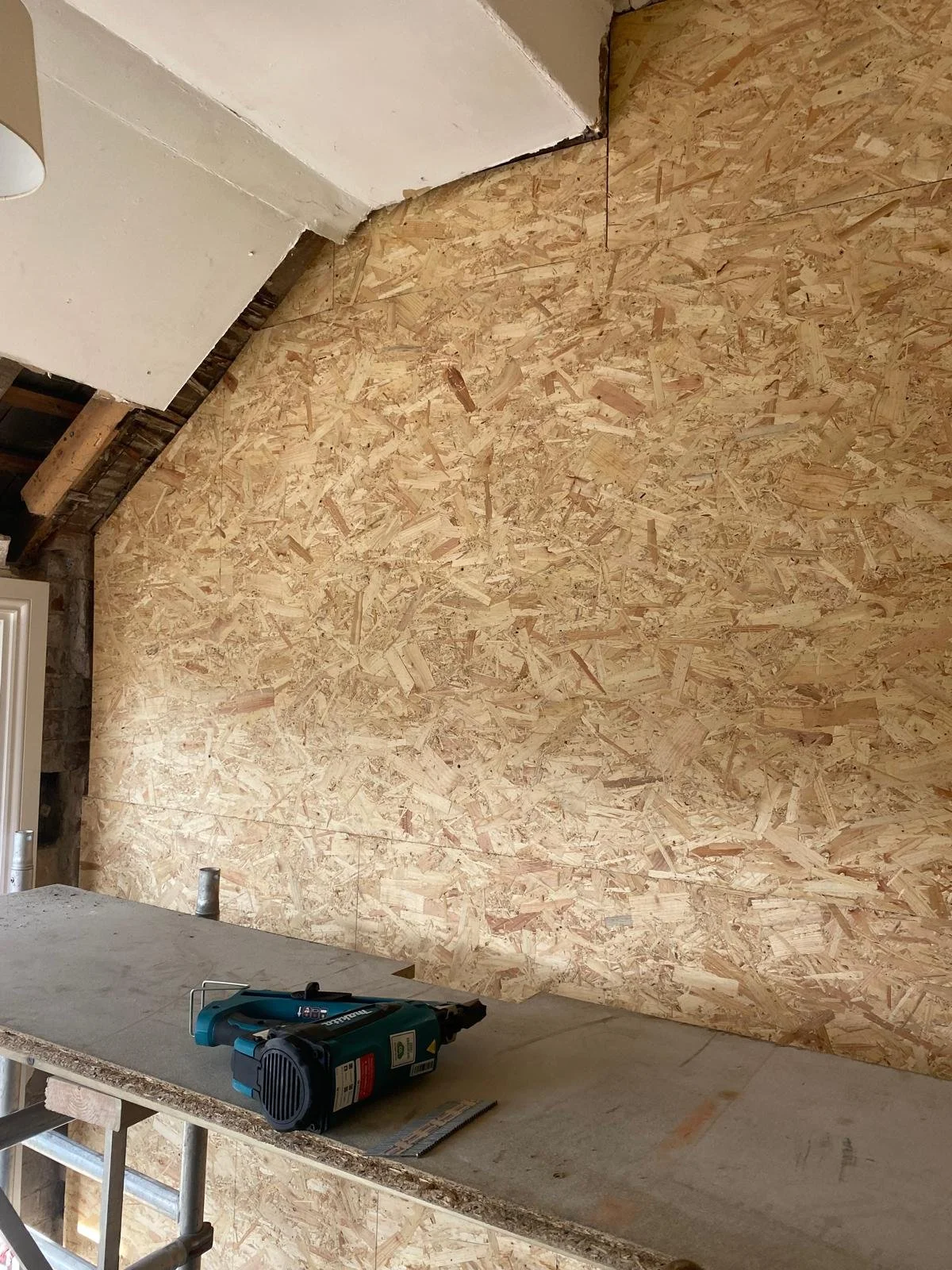Once the rotten timber was fully removed, the wall was rebuilt using C24 structural timber and sheathed with structural OSB for added strength. The work was finished with firecheck plasterboard and a multi-finish plaster skim to provide a compliant, durable interior surface.