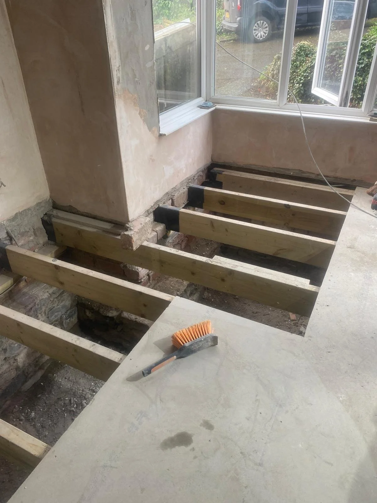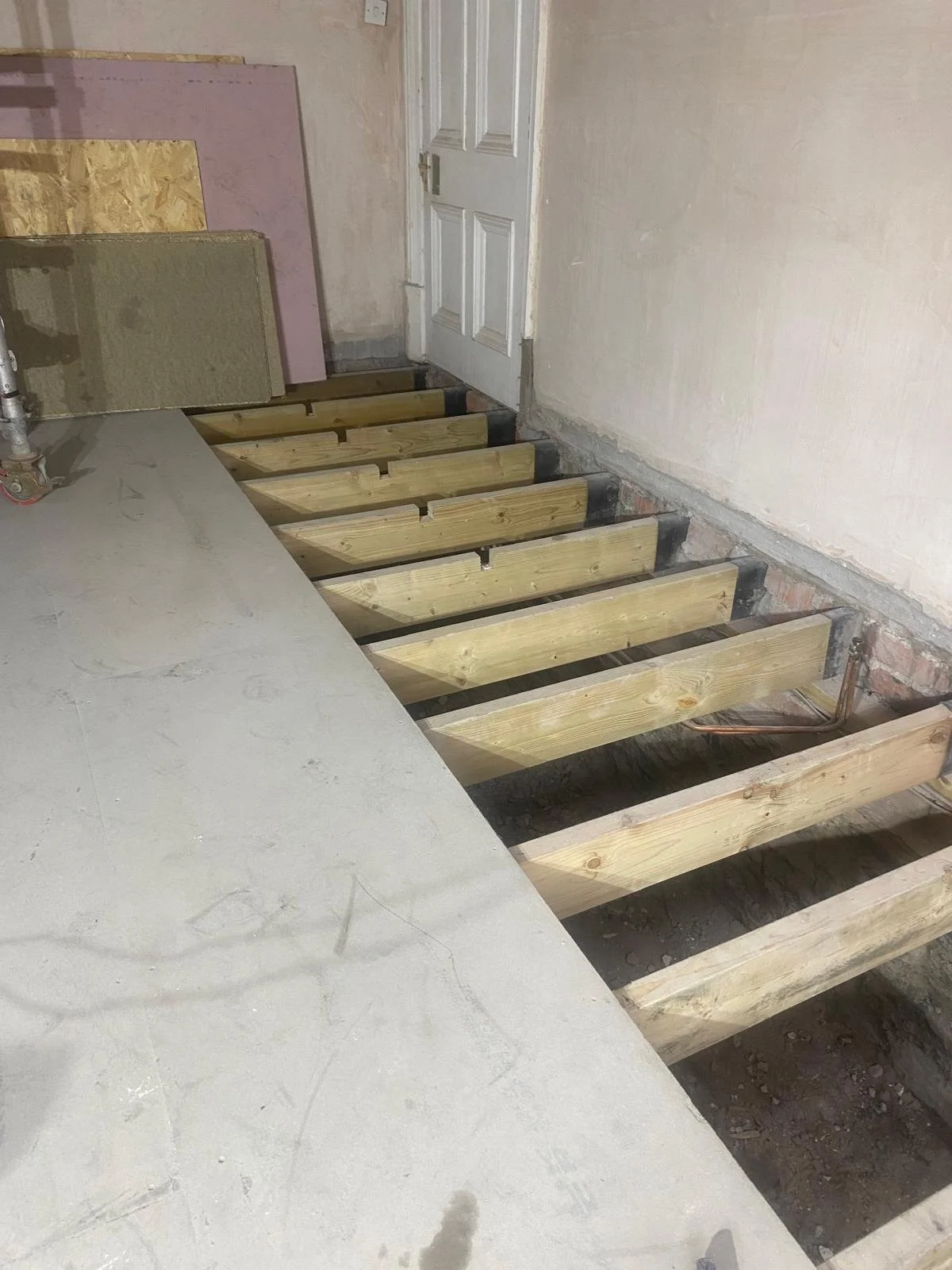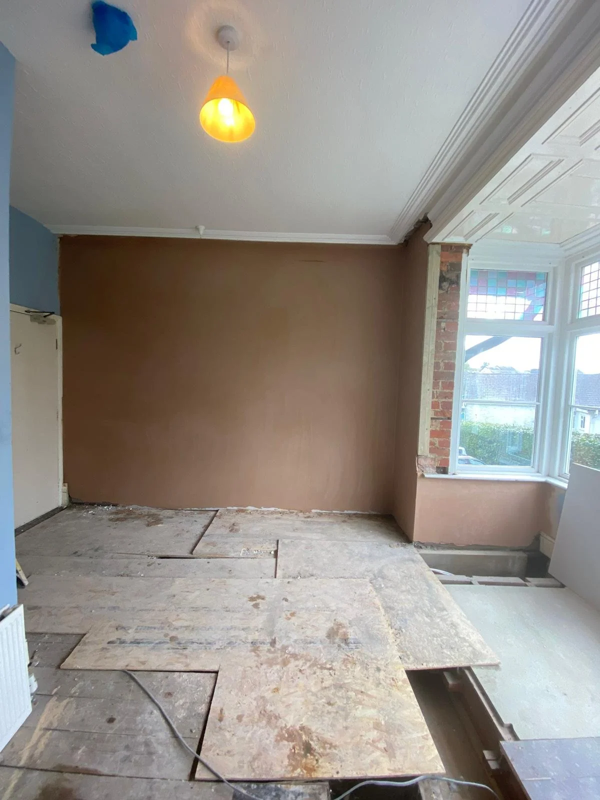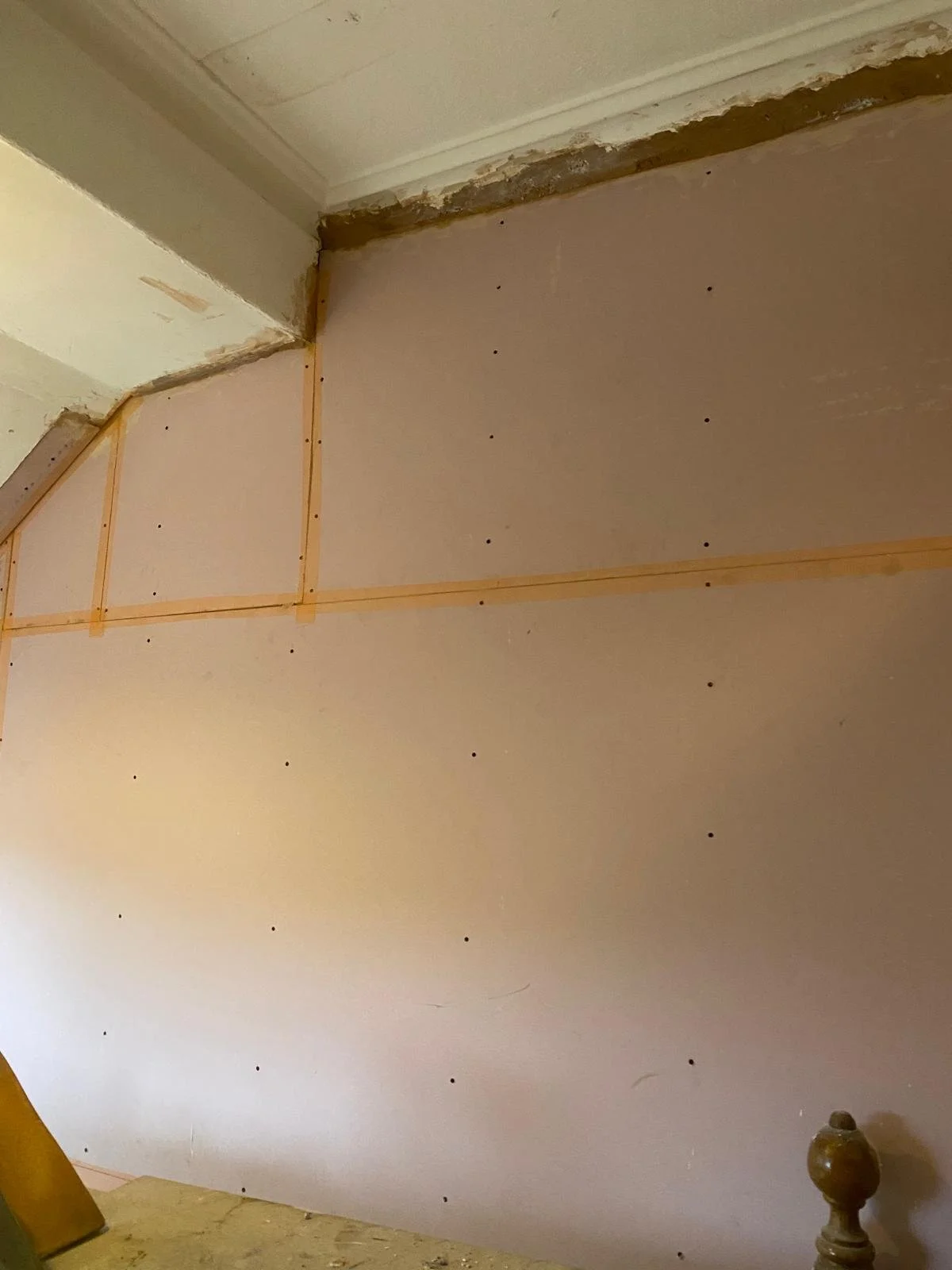 Once the rotten timber was fully removed, the wall was rebuilt using C24 structural timber and sheathed with structural OSB for added strength. The work was finished with firecheck plasterboard and a multi-finish plaster skim to provide a compliant, durable interior surface.