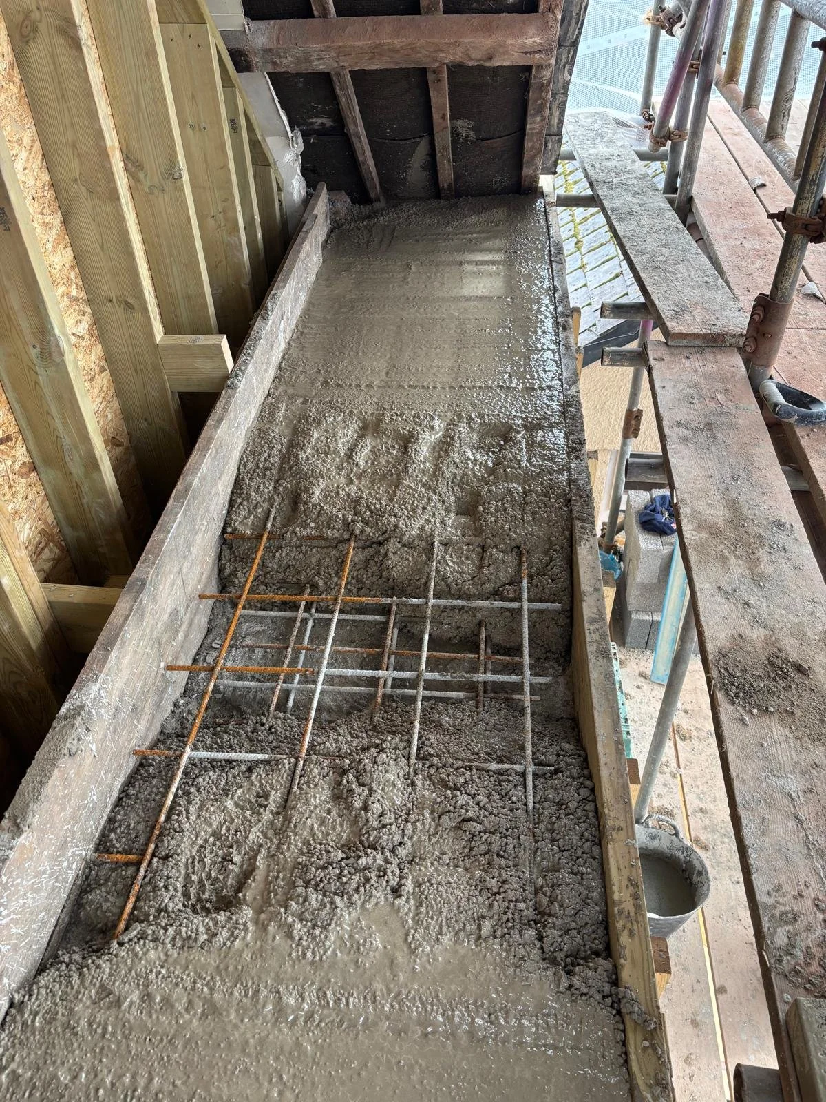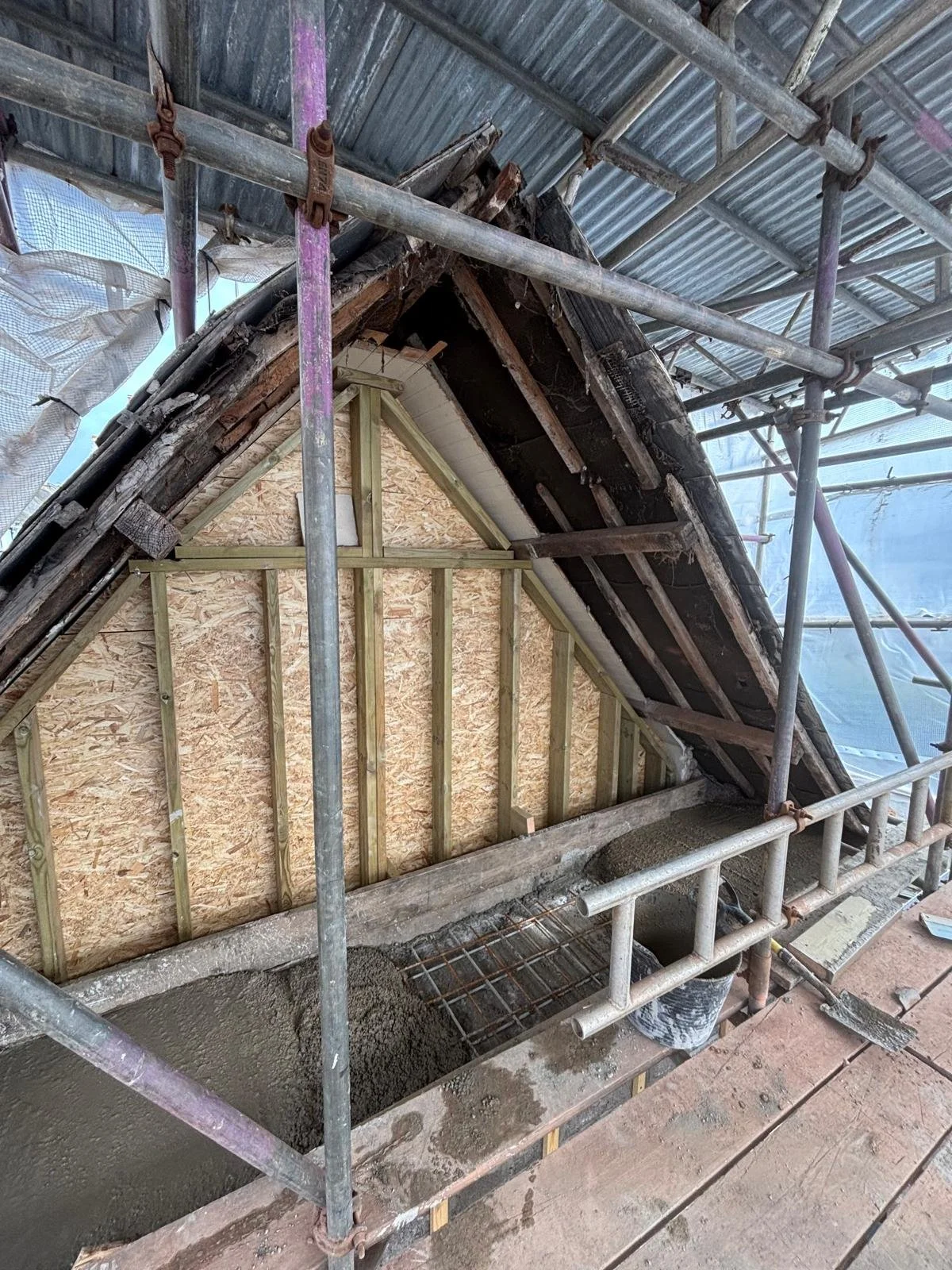 Partial removal of stone gable end. The project involved carefully removing the failing upper section of the existing gable end wall and constructing an internal structural timber wall to preserve the roof’s long-term integrity. We removed all loose and damaged stone as shown in the photographs, then provided reinforcement with a concrete pad to support the new blockwork installation.